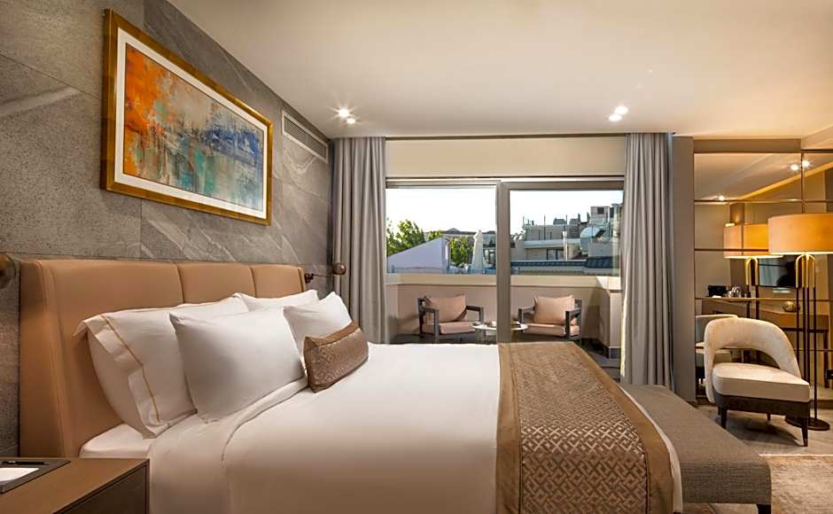 Our signature suites offer a dedicated to our guests’ specific needs. They provide a seamless and professional service and go above and beyond to create a personalized and an emotional experience. This suite has a balcony and sofa.
