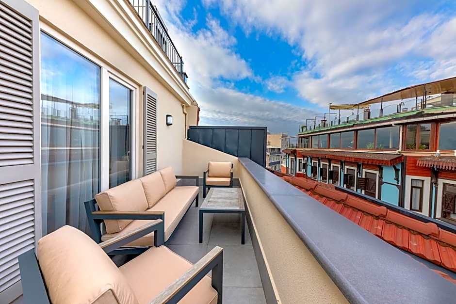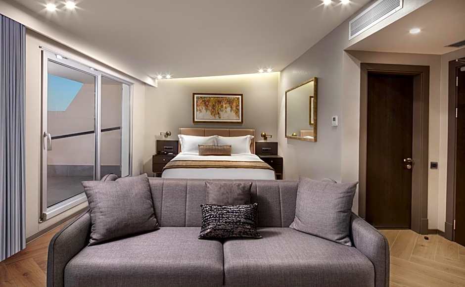Our signature suites offer a dedicated to our guests’ specific needs. They provide a seamless and professional service and go above and beyond to create a personalized and an emotional experience. This suite has a balcony and sofa.